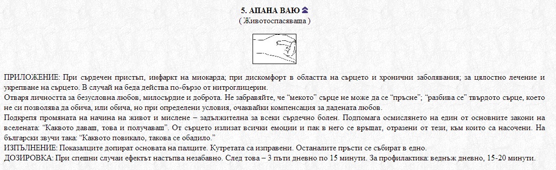 Всеки съвременен човек трябва да се научи да изпълнява мудрата, спасяваща живота, тъй като името ѝ не е дадено случайно и тя действително е способна да промени вашия живот, или живота на вашите приятели, роднини и близки. Мудрата се прави с двете ръце, облекчението идва много бързо и няма да ви кара да чакате.